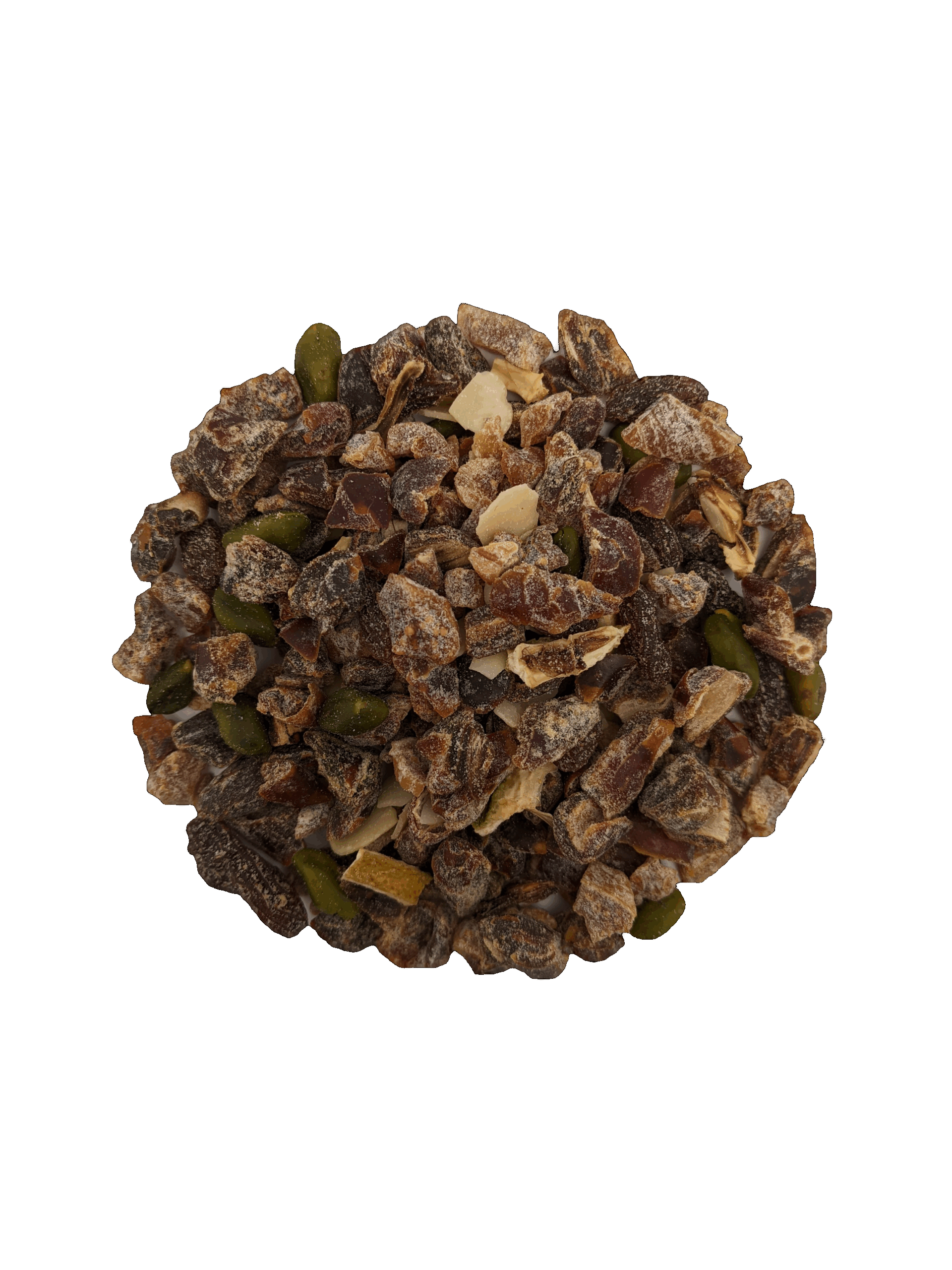 Ingrédient(s) : Dattes, figues, raisins verts, pistaches, amandes, zestes de citron vert et arômes.